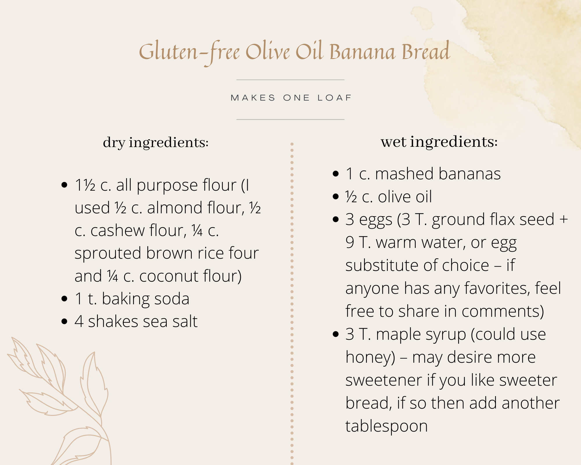 A moist banana bread sounded like just the thing I wanted to make. I stared at the recipe trying to figure how best to make it without granulated sugar. And free of gluten. I also wanted to use a different kind of oil. I was super nervous about my first attempt to bake the bread since I changed so many ingredients: flour, oil, sugar, amount of salt, etc. But oh my goodness if that bread did not look lovely once removed from the oven! Best part, it tasted delicious.