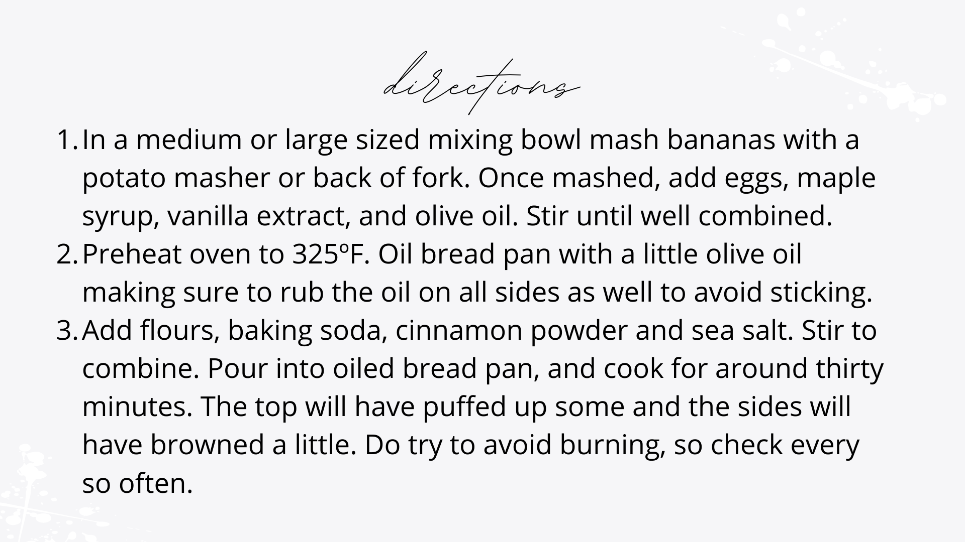 I really like banana bread. Bananas are a natural sweetener, and I tend to like the creamy texture bananas add to anything from smoothies to oatmeal. There are a few articles circulating the web claiming banana bread is something one should not eat because it has too much sugar and fat. My sweeteners are banana and maple syrup, and I do not use butter. Think of this as a less guilty banana bread.