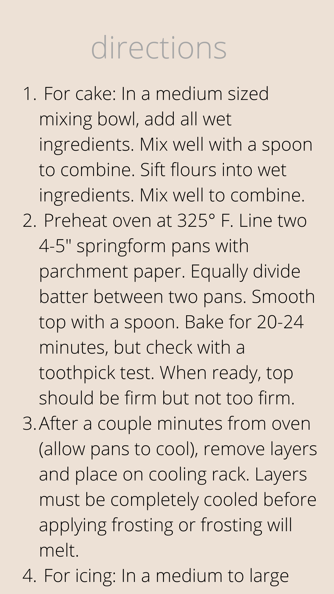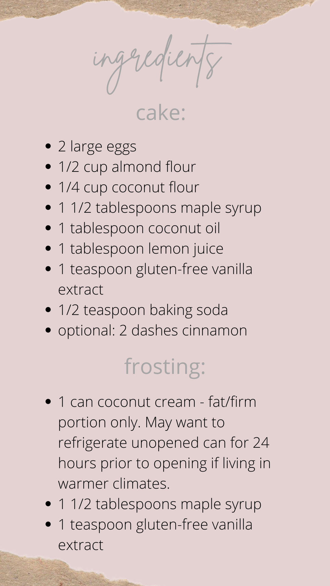 Notes: 1. How you use the coconut cream from the can is important. Do not add any of the coconut milk/water with the firm, white portion or else the frosting will have too much liquid. Also, if you live in a warmer climate, feel free to put unopened coconut can of milk/cream in refrigerator day prior so the coconut cream can firm. (In warmer temperatures, coconut cream turns to milk.) I always put my coconut cream cans in the fridge whenever summertime starts. 2. If you enjoy a sweeter cake, feel free to add another tablespoon of maple syrup to cake ingredients. 3. Make sure you let cake layers cool prior to adding frosting or frosting will melt. 4. Feel free to add coconut flakes on top of cake for decoration prior to serving. 5. Vegan substitute for eggs is a flaxseed egg: one egg equals one tablespoon of ground flaxseed plus three tablespoons of water (1 egg= 1 T. ground flaxseed+ 3 T. water).